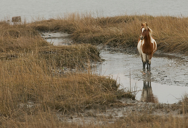 This photo was taken one morning after sunrise from the refuge road where it nears the beach. The ponies were walking thru the marsh towards where I was standing on the road. Framing is key when composing a nature photo and I could not have asked for a better situation as this pony